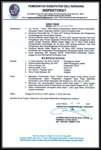 Demikian terungkap dalam Surat Tugas bernomor : 800.1.11.1/43/KH/2024  tertanggal 02 Juli 2024 yang ditandatangani H. Edwin Nasution, SH, M.Si, CGCAE) selaku Inspektur di Inspektorat Kabupaten Deli Serdang.