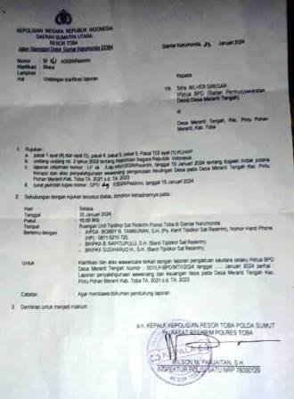 Menanggapi laporan tersebut, 23 Januari 2024, Polres Toba melayangkan surat panggilan kepada Wilher Siregar yang dalam hal ini sebagai Ketua BPD Meranti Tengah untuk klarifikasi atas laporan dugaan korupsi dan atau penyalahgunaan wewenang pengelolaan keuangan desa di Desa Meranti Tengah, Kecamatan Pintu Pohan Meranti, Kabupaten Toba yang diduga dilakukan oknum Kades Meranti Tengah.