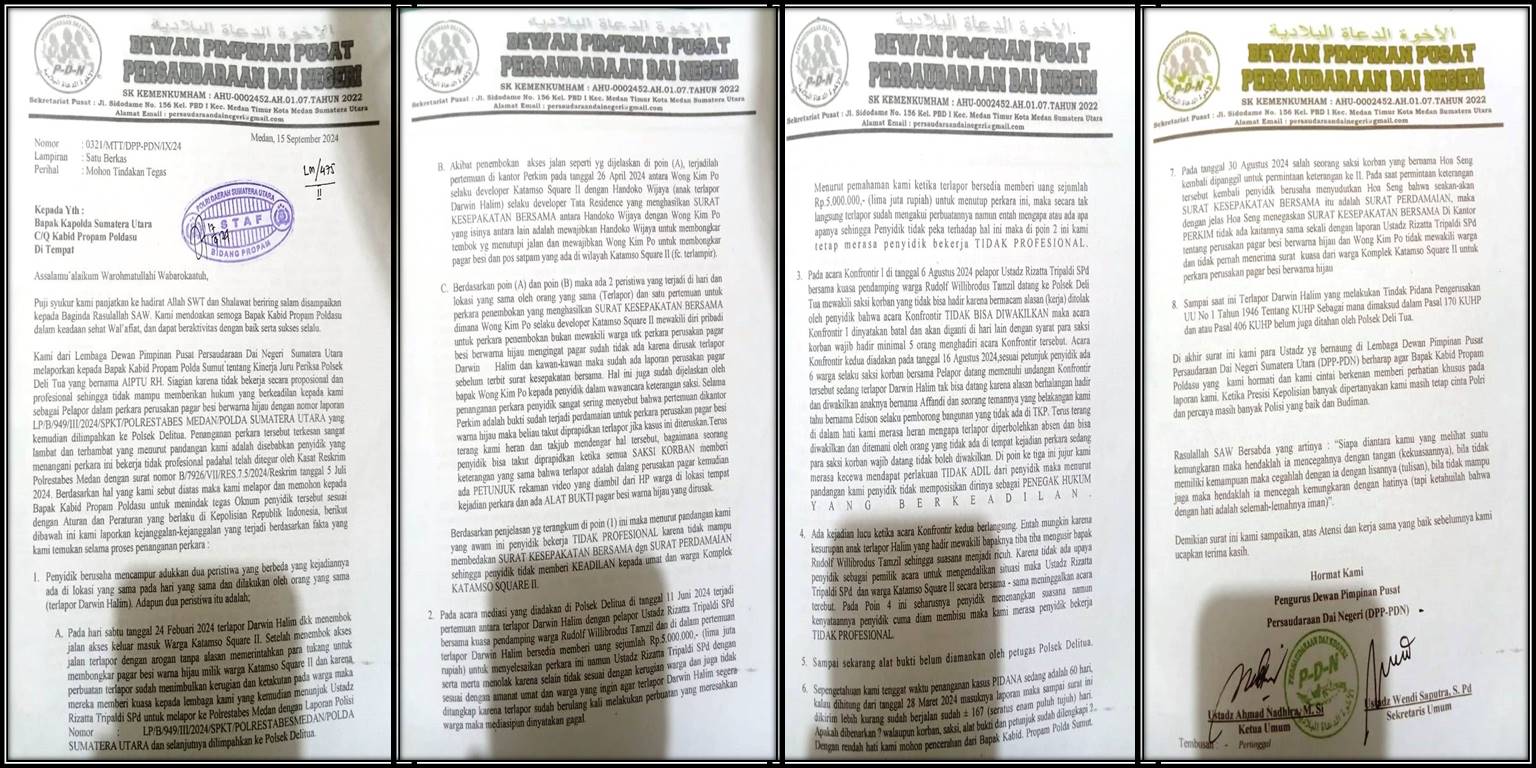 Atas dasar itu, melalui suratnya tertanggal 15 September 2024 dengan nomor 0321/MTT/DPP-PDN/IX/24, Pengurus Dewan Pimpinan Pusat Persaudaraan Da’I Negeri (DPP-PSN) yakni Ketua Umum (Ustadz Ahmad Nadhira) dan Sekretaris Umum (Ustadz Wndi Saputra) memohon kepada Kapolda Sumut melalui Kabid. Propam Polda Sumut agar menindak tegas oknum penyidik Polsek Deli Tua (Aiptu RH Siagian) yang diduga tidak profesional dalam melaksanakan tugas dan bahkan terkesan ‘main mata’ dengan pihak terlapor.