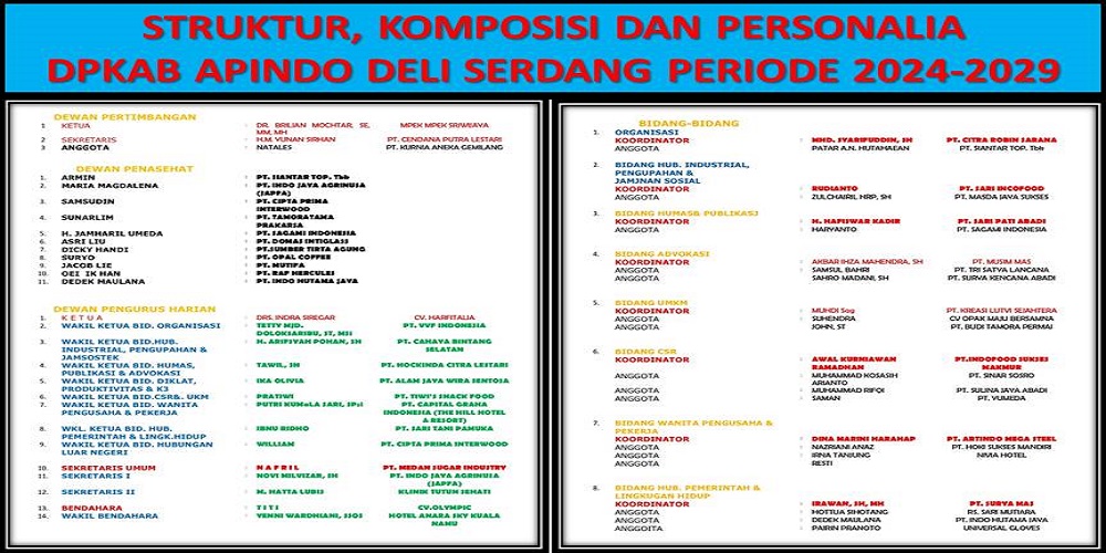 Berikut struktur, komposisi dan personalia DPKab. APINDO Deli Serdang Periode 2024-2029 yang dikukuh dan dilantik itu :