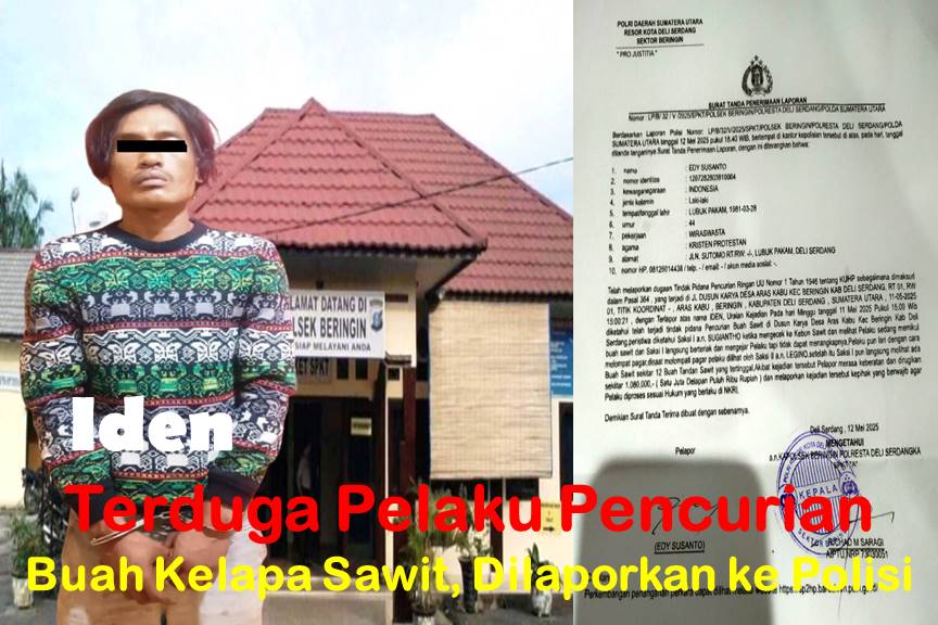 Dalam hal, Senin (12/5/2025) untuk kesekian kalinya, dengan Laporan Polisi (LP) Nomor : LP/B/32/V/2025/SPKT/POLSEK BERINGN/POLRESTA DELI SERDANG/POLDA SUMATERA UTARA, Edy Susanto melaporkan kasus pencurian buah kelapa sawit di areal kebun kelapa sawit milik orang tuanya (Edy Susanto) di Dusun Karya, Desa Aras Kabu, Kecamatan Beringin, Kabupaten Deli Serdang.
