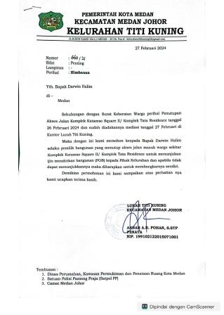 Dalam suratnya tertanggal 27 Februari 2024 dengan nomor 660/21 itu, Lurah Titi Kuning, Kecamatan Medan Johor, Kota Medan (Akbar AR Pohan S. STP) meminta agar Darwin Halim selaku pemilik bangunan tembok yang menutup akses jalan keluar-masuk warga di sekitar Komplek Katamso Square II/Komplek Tata Residence itu agar menunjukkan ijin mendirikan bangunan tembok tersebut kepada pihak Kelurahan Titi Kuning, Kecamatan Medan Johor, Kota Medan.